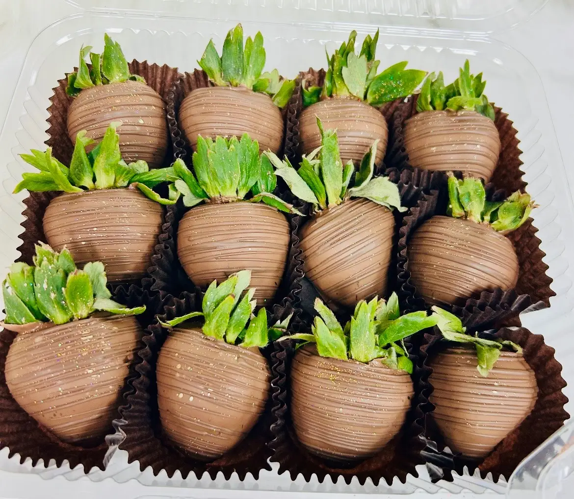 1 dozen strawberries dipped in sugar free chocolate or carob chips ( VEGAN ) finished with a contrasting chocolate stripe