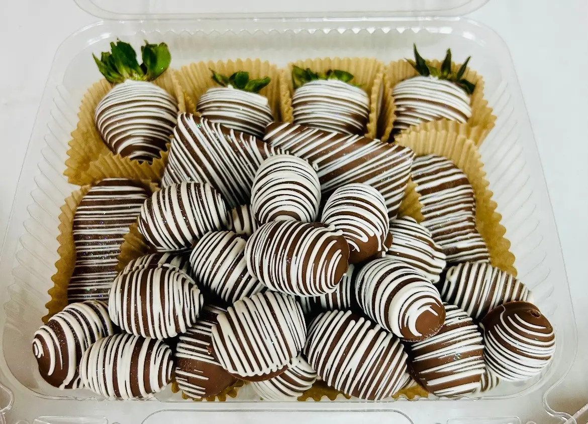 1 pound seedless grapes 4 strawberries 2 graham crackers dipped in milk chocolate finished with a contrasting chocolate stripe