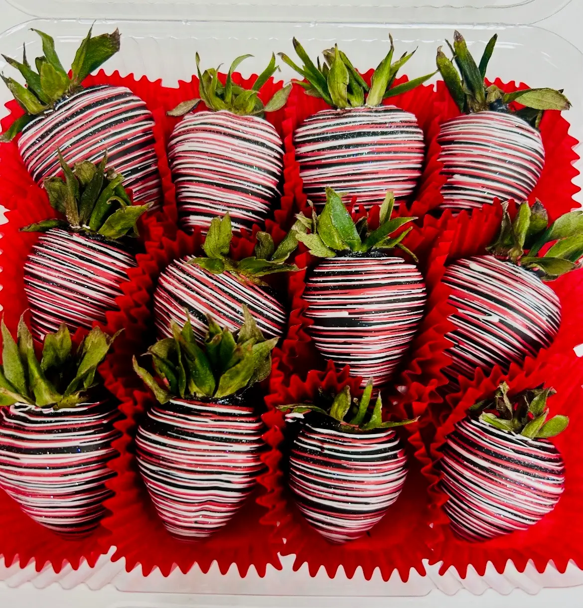 1 dozen strawberries dipped in milk chocolate finished with a contrasting chocolate stripe